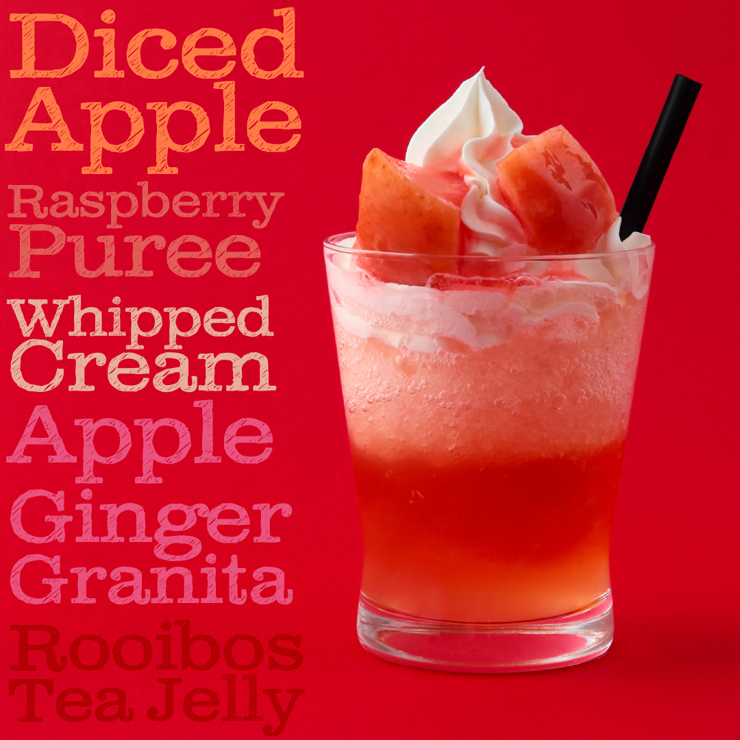 果肉まるごと林檎グラニータに、ルイボスティージュレが上品に香る。林檎ダイスとラズベリーピューレの食感と酸味がアクセント。ジンジャーの隠し味が甘さの中に刺激を与え、大人の味わいを演出。ノンカフェインの罪悪感ゼロな贅沢ドリンク。