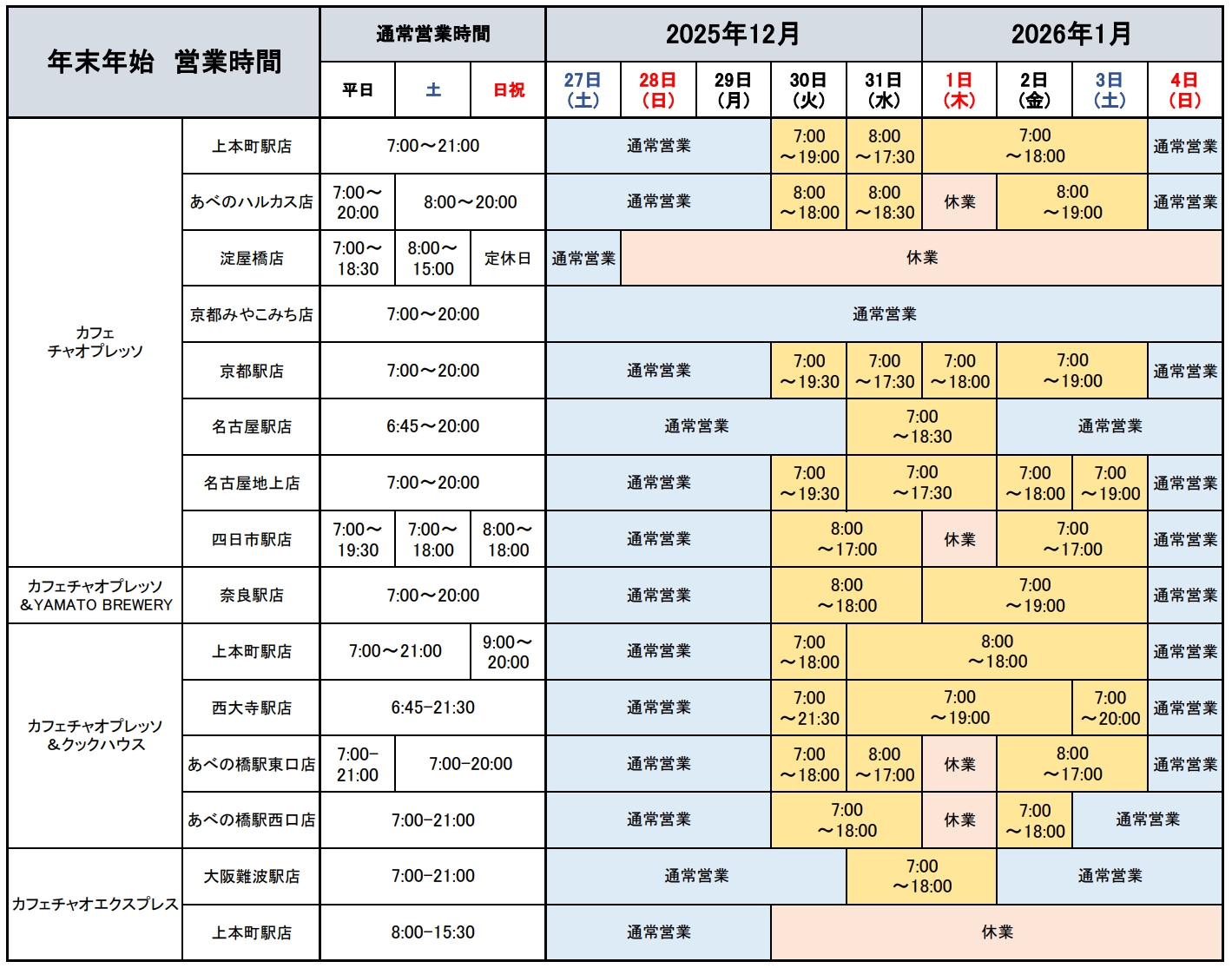 2025-2026年末年始 営業時間のお知らせ 2025年12月24日 いつもチャオプレッソをご利用いただきありがとうございます。 年末年始期間の営業時間は下記の通りとさせていただきます。 皆様のご来店を心よりお待ちしております。 一覧に戻る